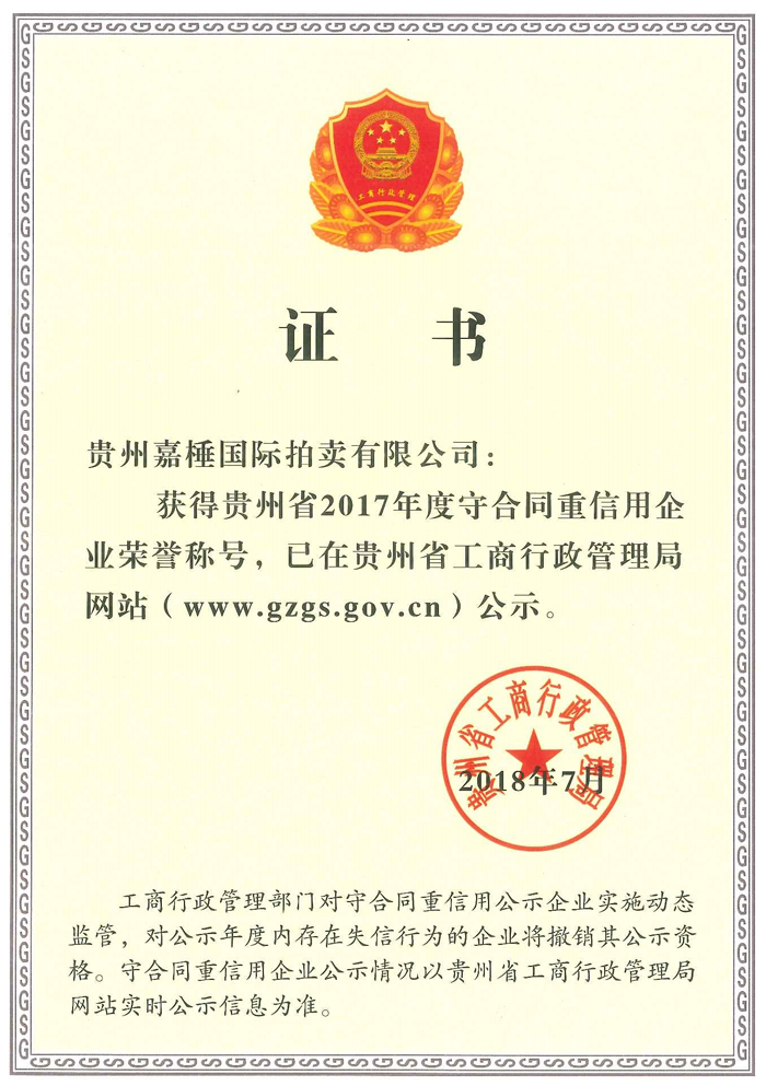 貴州嘉棰國際拍賣有限公司是主要從事動產、不動產、無形資產和文物藝術品拍賣業務的大型綜合性拍賣企業,是中國拍賣行業協會會員,貴州省拍賣行業協會理事單位,中國拍賣行業協會AA級資質企業,貴州省連續十一年重合同守信用企業,全省拍賣先進企業,貴州省公物拍賣人。公司充分利用多年來積累的客戶資源和全新的經營理念服務于貴州經濟發展。同時也為貴州省國有企業的資產重組、改制改造以及不良資產的變現,起到積極的作用。貴州嘉棰國際拍賣有限公司自成立以來,多次成功地組織了房產、土地、機器設備和各種物資等標的拍賣。并于2001年12月成為第一批貴州省高級人民法院及多家金融機構指定的拍賣企業。 公司下設產權部、市場發展部、財務部、人事部和辦公室?,F有員工11名,大專以上學歷員工占總數的90%,擁有精通業務的專門人才。有國家注冊拍賣師3名,公司工作人員大多參加過中國拍賣行業協會組織的從業資格培訓。公司堅持“客戶至上,執業嚴謹,公平競.....